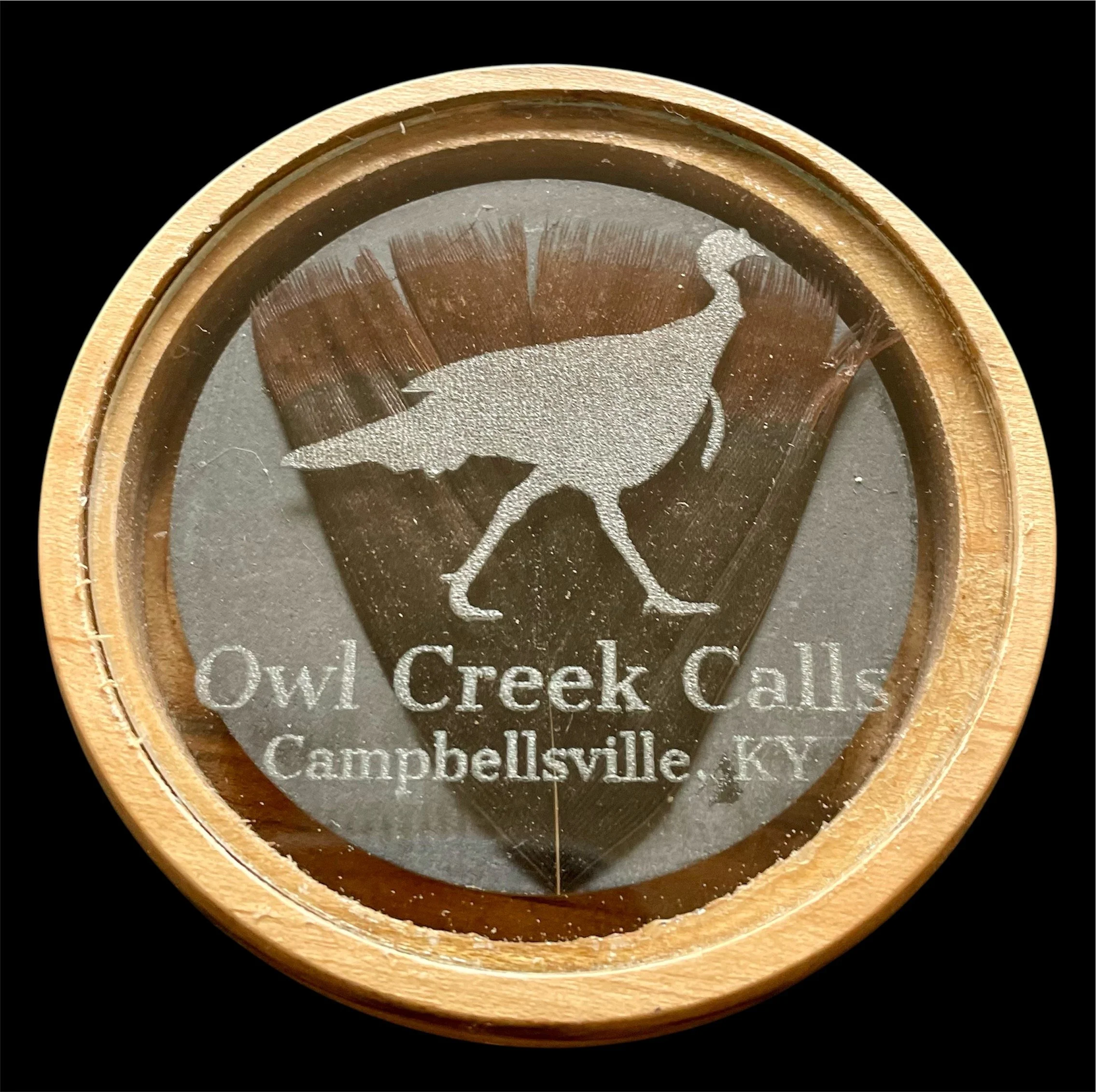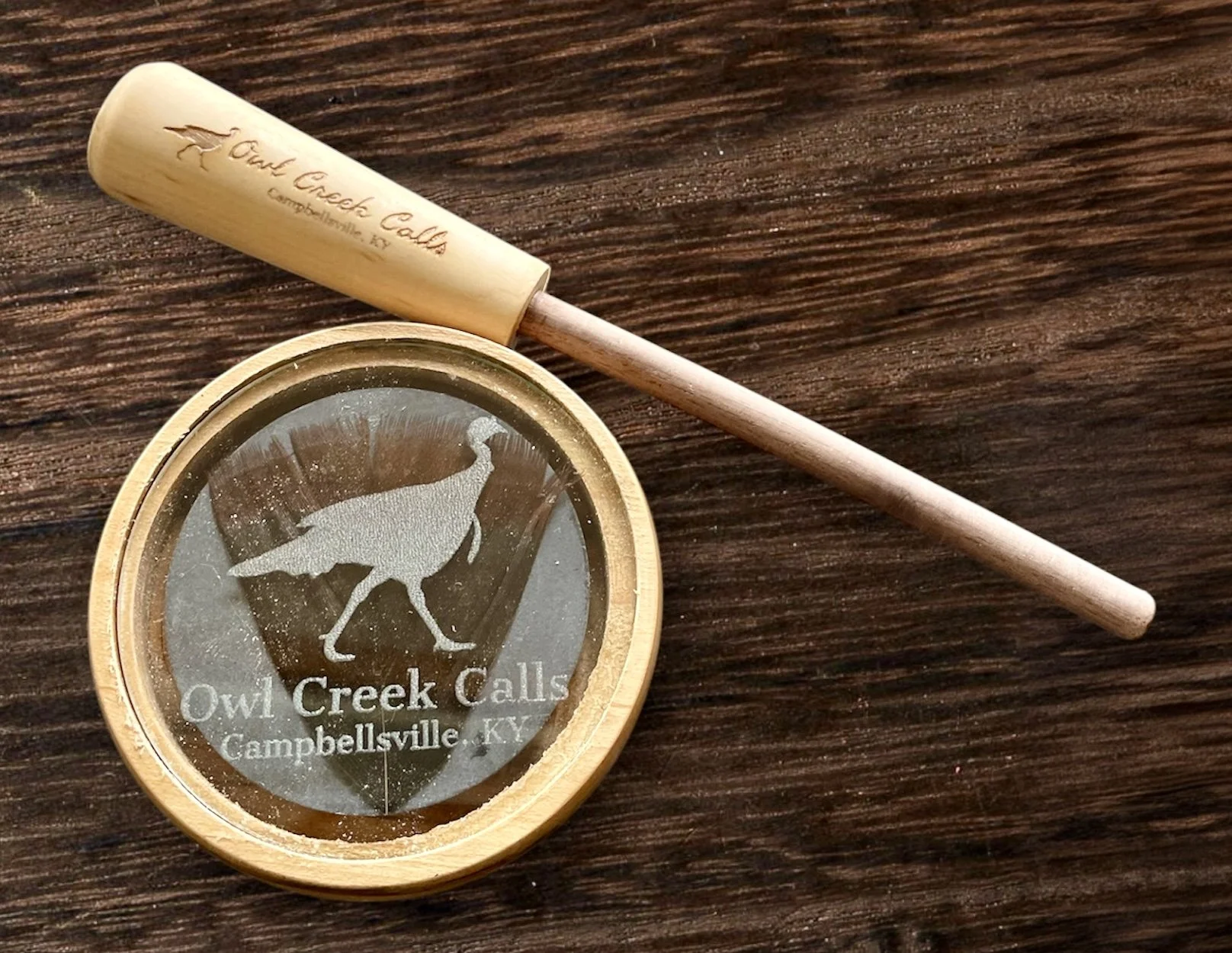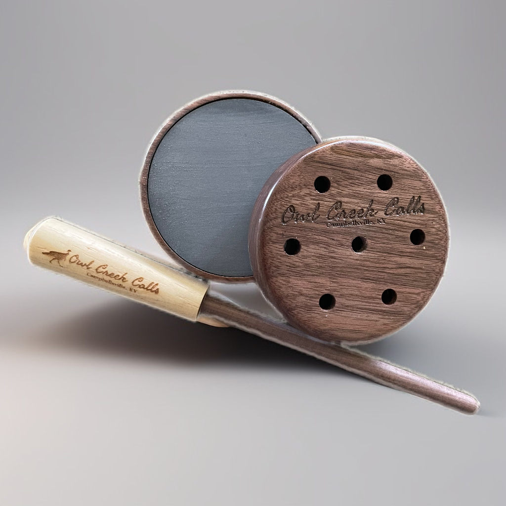 New to our lineup is our 3.5” aluminum over glass in a cherry pot. It features a 3.5” green anodized aluminum that has been blasted in order to make it more user friendly. It comes with a walnut striker with cherry striker head; this combination produces a high pitch than a standard slate call with makes it perfect for longer range calling or when you are hunting on a windy day!